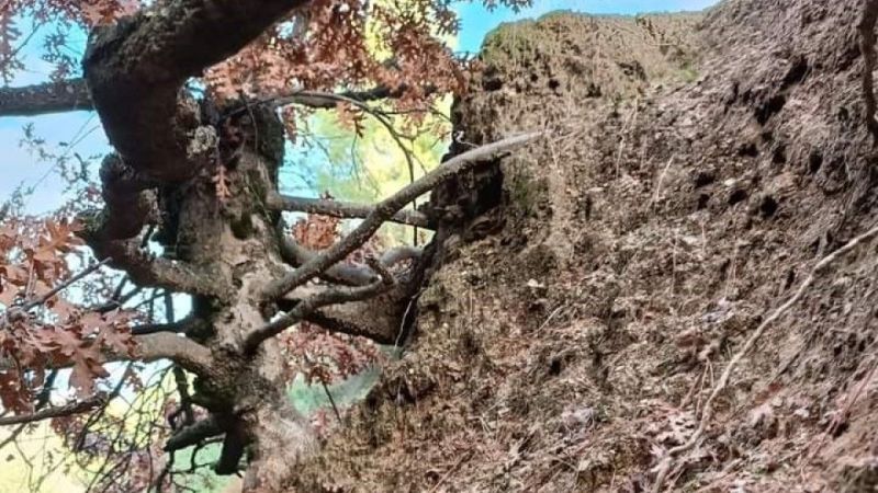 Manisa’nın Sarıgöl ilçesindeki bir yamaçta bulunan yaşlı meşe ağacı, köklerinin yarısı dışarıda yarısı toprakta hayata sımsıkı tutunan görüntüsüyle görenlerin ilgisini çekiyor.