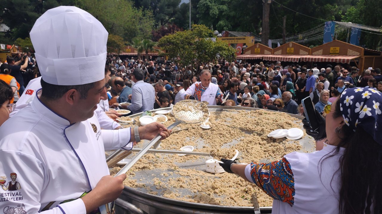 Manisa'nın en önemli buluşma noktalarından biri olan Ulupark'ta devam eden Gastronomi Panayırı’nda, 5 bin kişilik tarhana çorbasının ardından bu kez dev kazanlar bahar pilavı için kaynadı. Dokuz Eylül Üniversitesi Gastronomi ve Mutfak Sanatları Bölümü Ana Bilim Dalı Başkanı Doç. Dr. Turgay Bucak'ın özel reçetesiyle hazırlanan dev organizasyonda, yaklaşık 100 şef görev aldı. Vatandaşların yoğun ilgi gösterdiği dağıtımda, 2 tonluk pilav kısa sürede tüketildi.