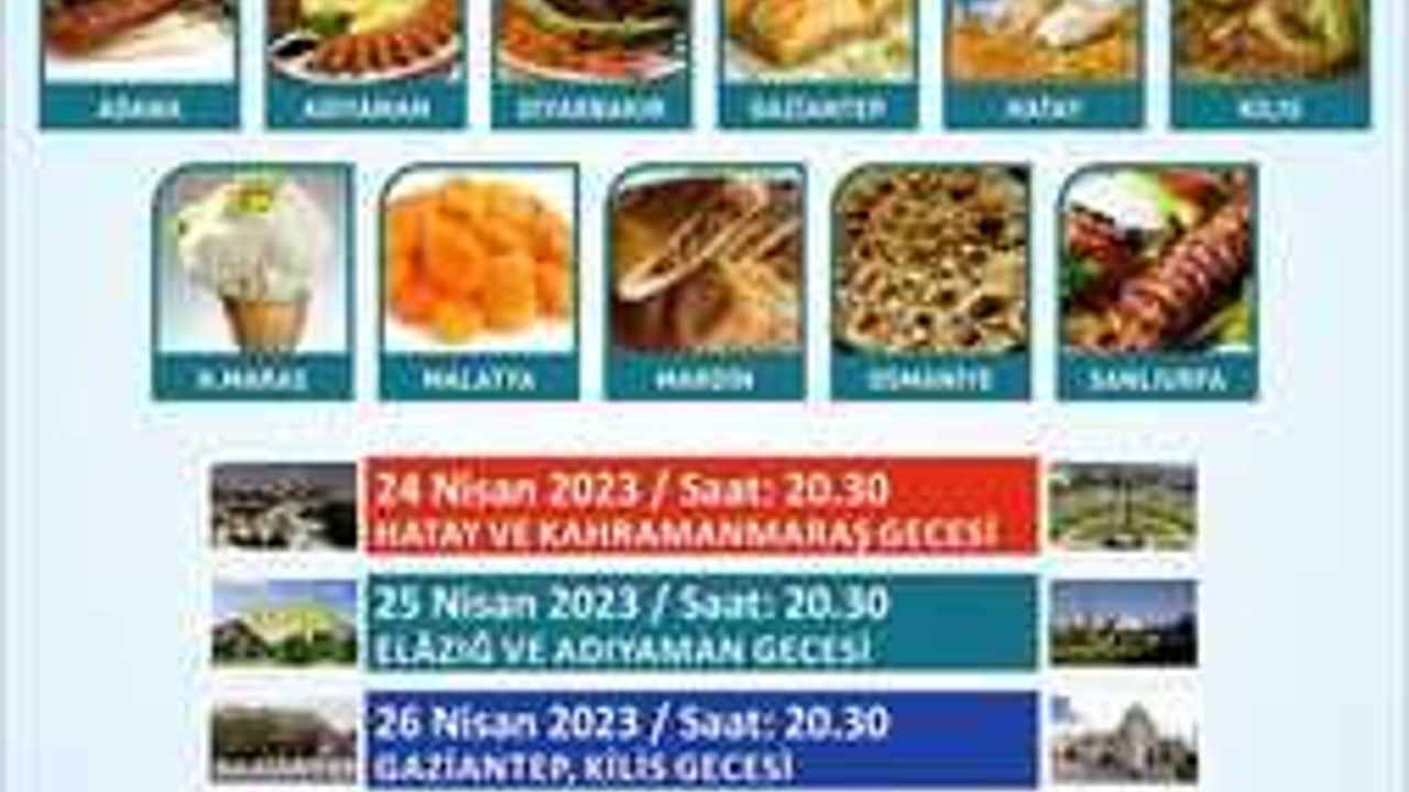 10 güne yayılacak olan dayanışma günlerinde ayrıca 24 Nisan Pazartesi akşamı Hatay ve Kahramanmaraş, 25 Nisan Salı Akşamı Elazığ ve Adıyaman, 26 Nisan Çarşamba günü Gaziantep ve Kilis, 27 Nisan Perşembe günü Adana ve Osmaniye, 28 Nisan Cuma günü Diyarbakır ve Malatya, 29 Nisan Cumartesi günü de Şanlıurfa gecesi düzenlenecek. Etkinlikler 30 Nisan Pazar günü saat 16’da düzenlenecek olan halk müziği konseriyle son bulacak.