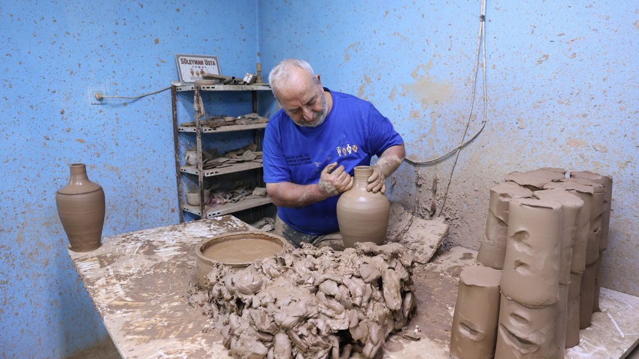 Efeler ilçesi Kardeşköy Mahallesi'nde bulunan imalathanesinde oğullarıyla birlikte çömlekçilik yapan Süleyman İri, dedesinden kalan mesleği dört kuşaktır sürdürüyor.
