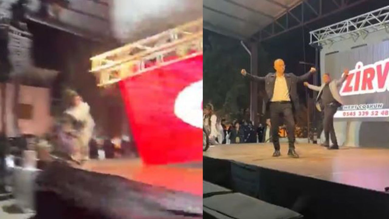 Başkanın sahneyi terk etmesiyle muhtemel bir facianın eşiğinden dönülürken, yürekler ağza geldi. Ucuz atlatılan kaza amatör kameraya böyle yansıdı.