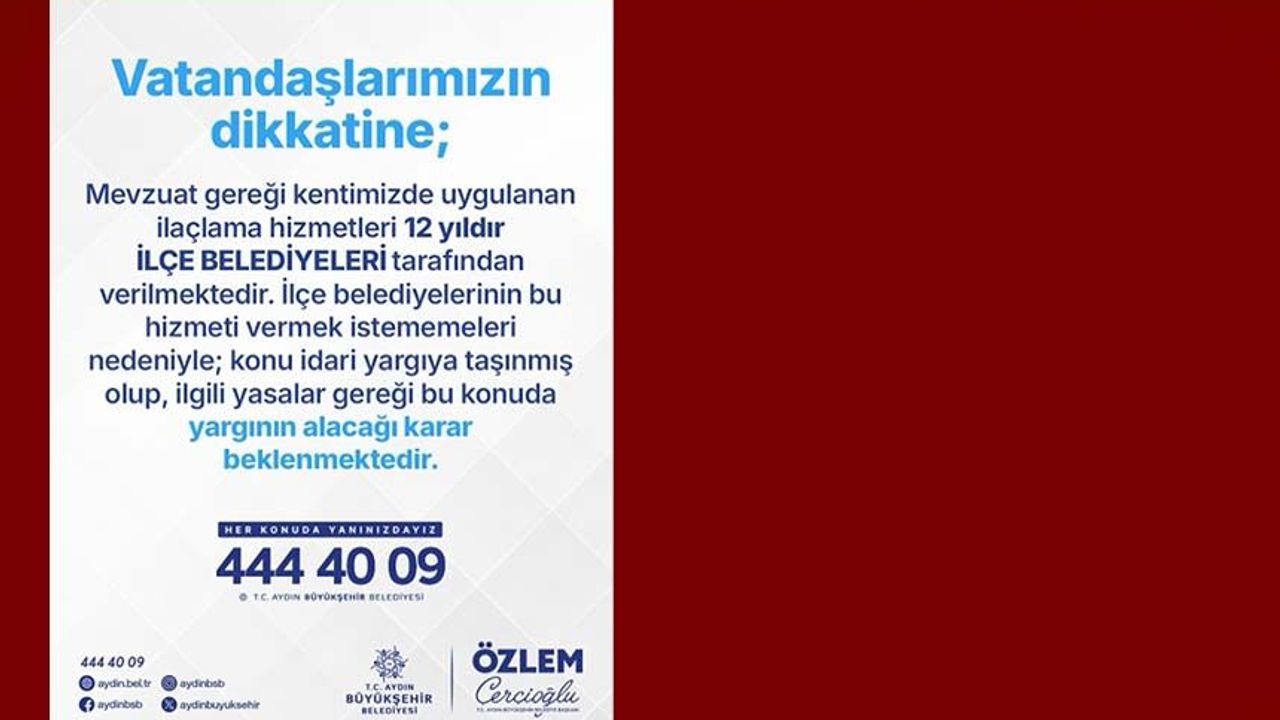 Belediyeden yapılan duyuruda, ilaçlama hizmetlerinin yaklaşık 12 yıldır ilçe belediyeleri tarafından verildiği belirtilerek, bazı ilçe belediyelerinin bu hizmeti yürütmek istememesi nedeniyle konunun idari yargıya taşındığı ifade edildi.