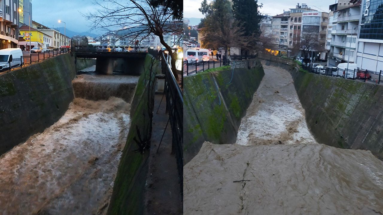 Dağlardan gelen ve sokaklarda bulunan mazgallar ile dereye akan yağmur suları dereyi coştururken, suyun debisinin de arttığı gözlemlendi.