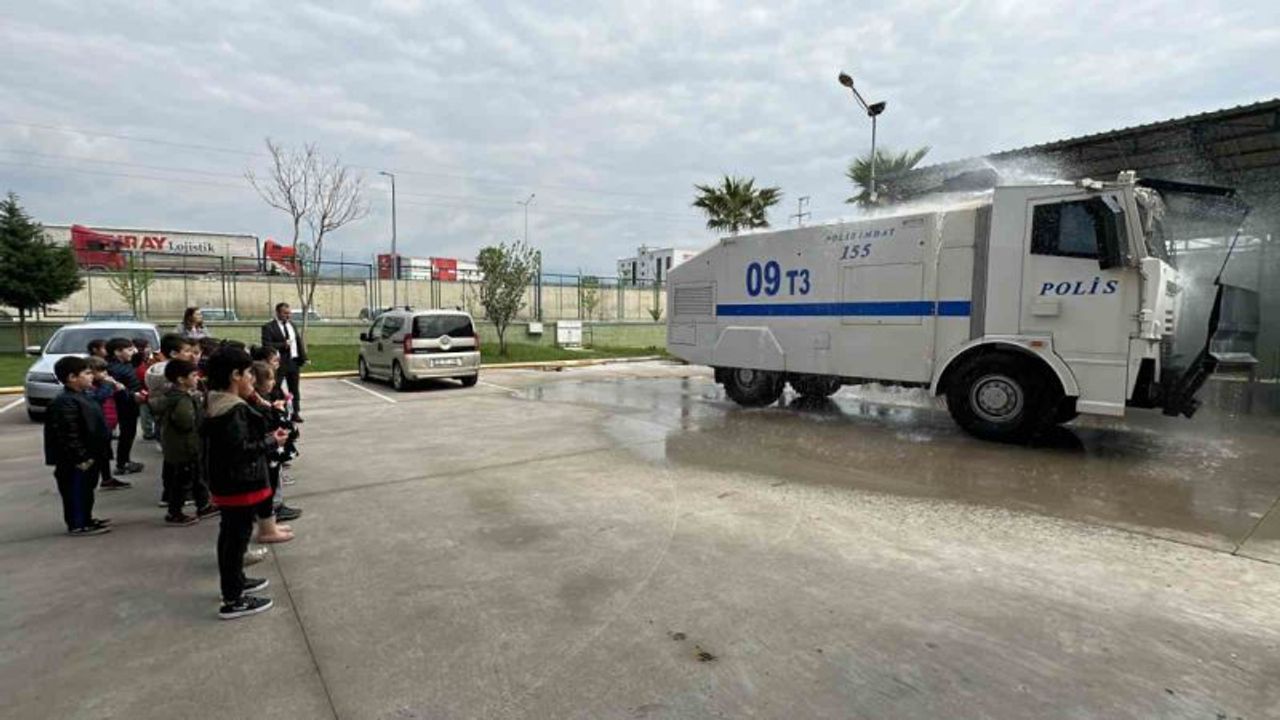 Aydın’ın Nazilli ilçesinde öğrenciler polis haftasını kutlamak üzere ziyarete gittikleri ilçe emniyet müdürlüğünde büyük heyecan yaşarken, polis araçlarına yoğun ilgi gösterdi.