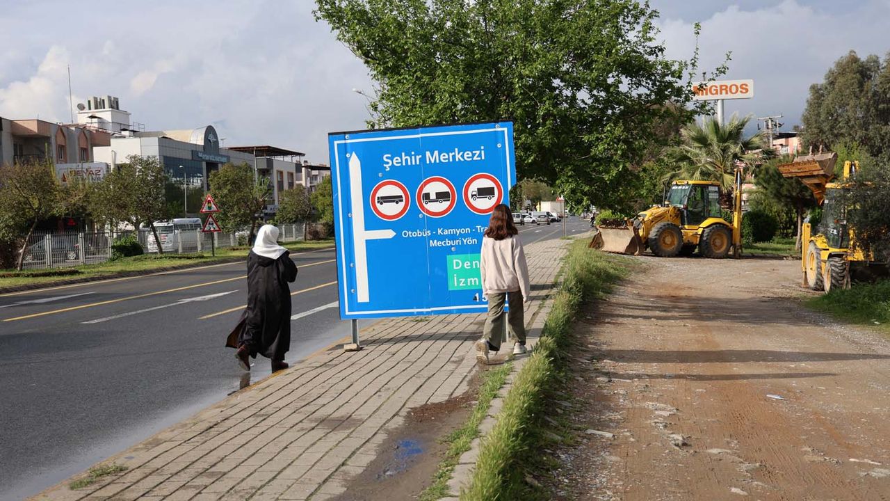 Muğla’dan Aydın’a girişe göre yolun sağ tarafındaki kaldırıma dikilen ve yaya kaldırımını tamamen kullanım dışı bırakan trafik levhası nedeniyle yayalar kaldırımı kullanamadı.