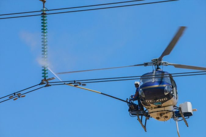 Geçen sürede toz, kum, kimyasal atıklar, tarımsal ilaçlar, deniz tuzu gibi nedenlerle kirlenen ve iletim sisteminin performansını azaltan izolatörlerin temizliği, helikopterden sıkılan saflaştırılmış suyla yapılıyor.