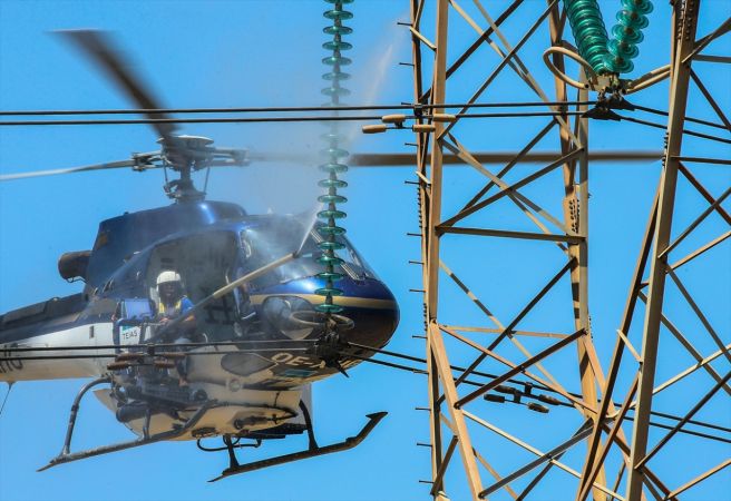 Yüksek gerilim hatlarında zamanla kirlilik ve çevre koşullarına bağlı iletim performansı azalan izolatörler (yalıtkan malzeme), helikopterden sıkılan saflaştırılmış suyla temizleniyor.