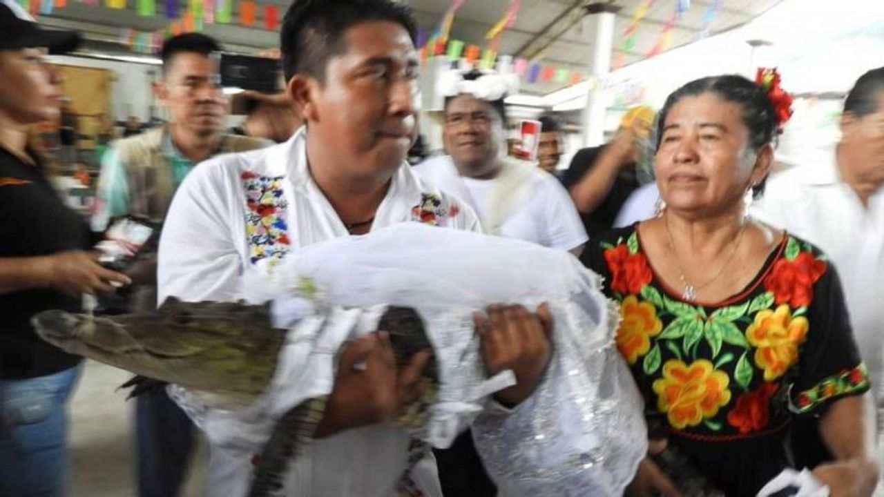Meksika’nın San Pedro Huamelula Belediye Başkanı Victor Hugo Sosa Garcia halka şans getirmesi için gelinlik giydirilen timsahla evlendi. Şehir sakinleriyle bol bol dans ettirilen timsah, son olarak nikah için belediye sarayına getirildi.