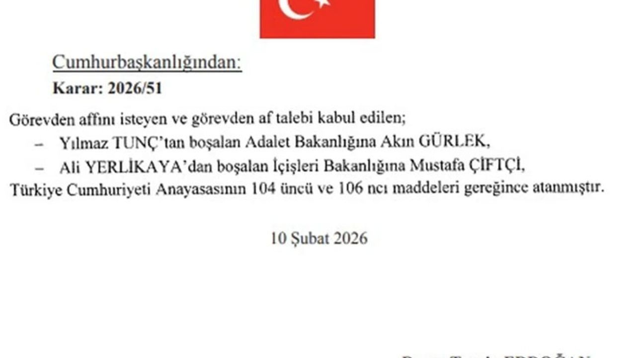 Adalet Bakanlığı’na Akın Gürlek, İçişleri Bakanlığı’na Mustafa Çiftçi getirildi.