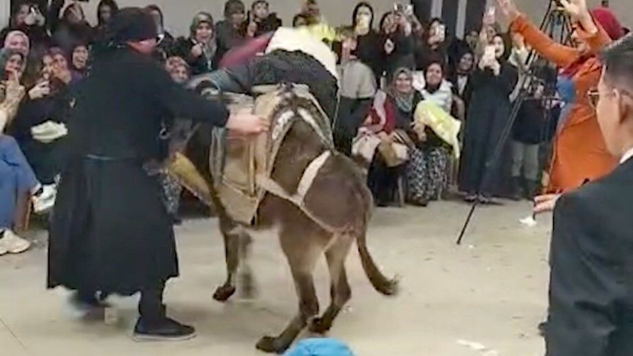 Manisa'nın Gördes ilçesine bağlı Beğenler Mahallesi'nde Birkan ve Tuğba Çoban çiftinin kına gecesinde damadın arkadaşları ilginç bir sürpriz yapmak istedi. Damadın arkadaşı Halil Çetin, eşeğe binerek kına gecesinin gerçekleştirildiği kapalı salona girdi. Misafirlerin arasında eşekle gezen Halil Çetin, şov yapmak istediği sırada misafirlerin üzerine doğru düştü. Renkli görüntülere sahne olan ‘damat eğlencesinde' misafirler kahkahaya boğulurken eşekten düşen Halil Çetin olayı yara almadan atlattı.