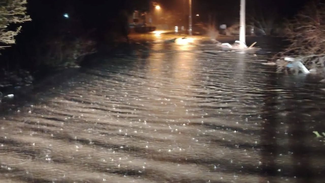 Taşkın nedeniyle bazı noktalarda yolun suyla kaplandığı görülürken, ekipler suyun tahliyesi ve güvenliğin sağlanması için çalışmalarını sürdürüyor.