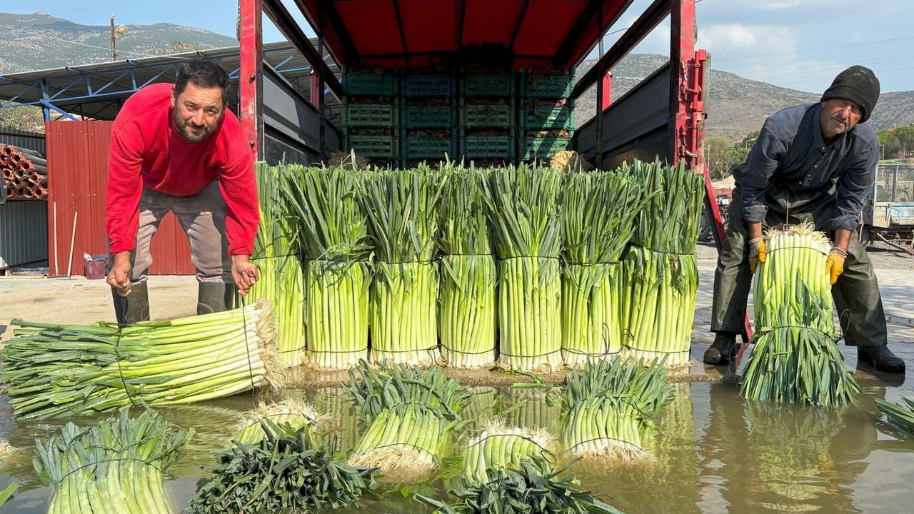 Menemen ilçesinde, verimli tarım arazilerine sahip Gediz Ovası'nda pırasa hasadı gerçekleştiriliyor.
