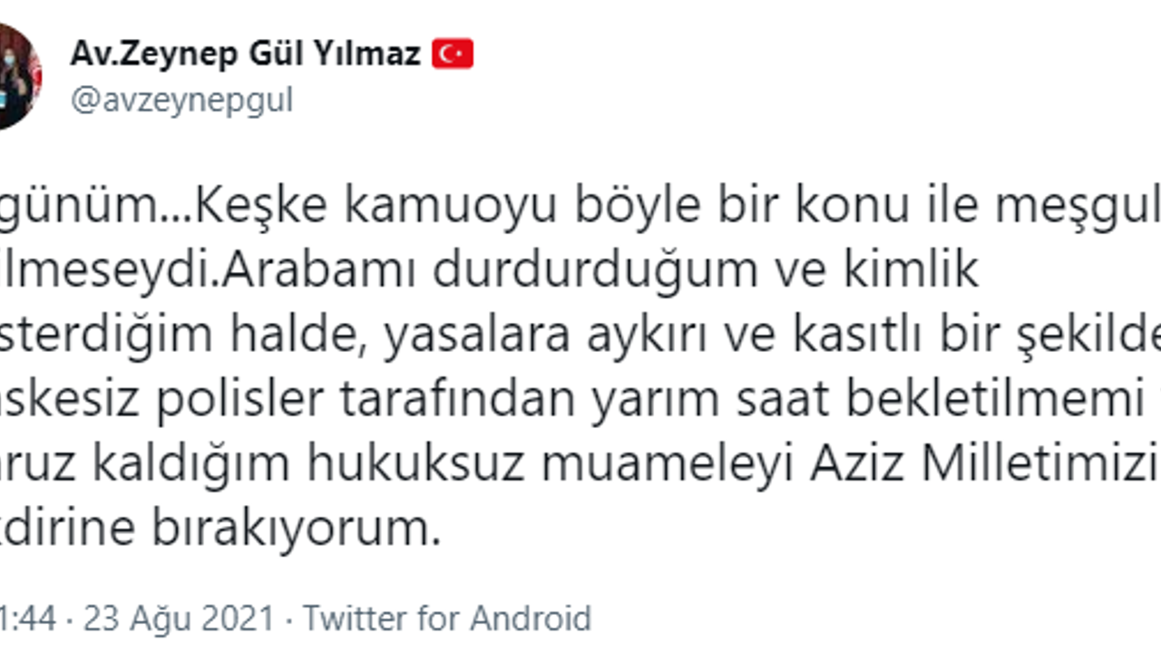 "Üzgünüm...Keşke kamuoyu böyle bir konu ile meşgul edilmeseydi.Arabamı durdurduğum ve kimlik gösterdiğim halde, yasalara aykırı ve kasıtlı bir şekilde maskesiz polisler tarafından yarım saat bekletilmemi ve maruz kaldığım hukuksuz muameleyi Aziz Milletimizin takdirine bırakıyorum."
