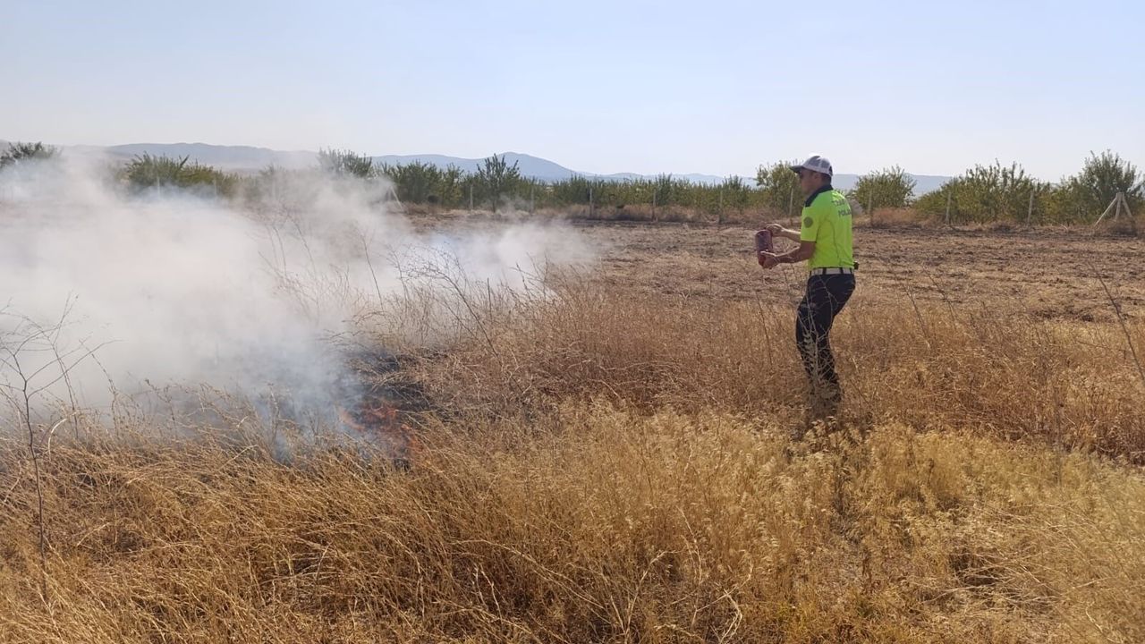 Ardından araçta bulunan yangın tüplerini alan polis ekipleri yangına müdahale ederek söndürdü. Polislerin müdahalesi ile alevler diğer tarlalara sıçramadan söndürüldü.