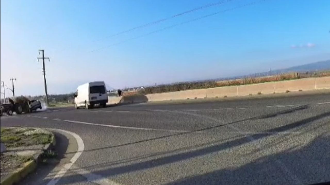 Görüntülerde, otomobilin yeşil ışıkta geçmek için hareket ettiği sırada tali yoldan çıkantraktörün tuğla yüklü römorkuna çarptığı anlar yer aldı.