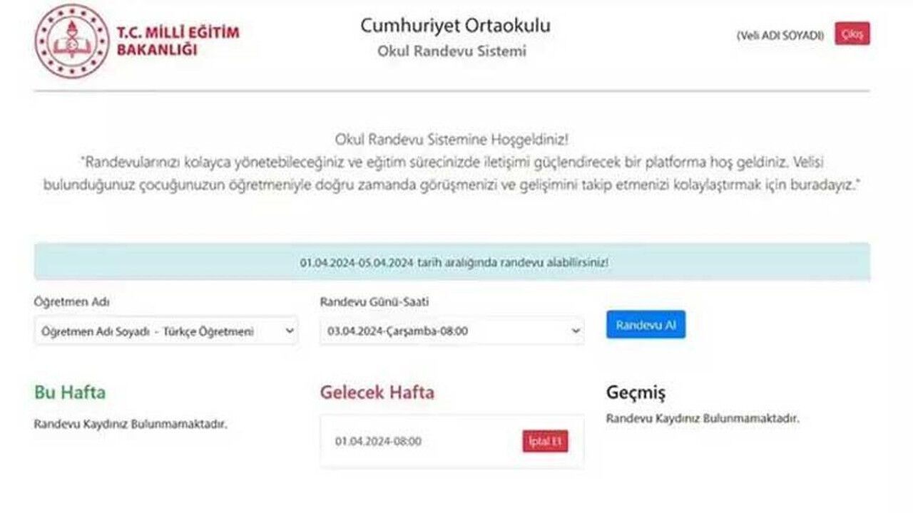 Veliler, okulun internet sitesi üzerinden e-devlet kullanıcı bilgileriyle sisteme giriş yapıyor. Sistemde, öğretmenlerin müsaitlik tablosundan boş olan zaman dilimleri için randevu talebinde bulunabiliyor.