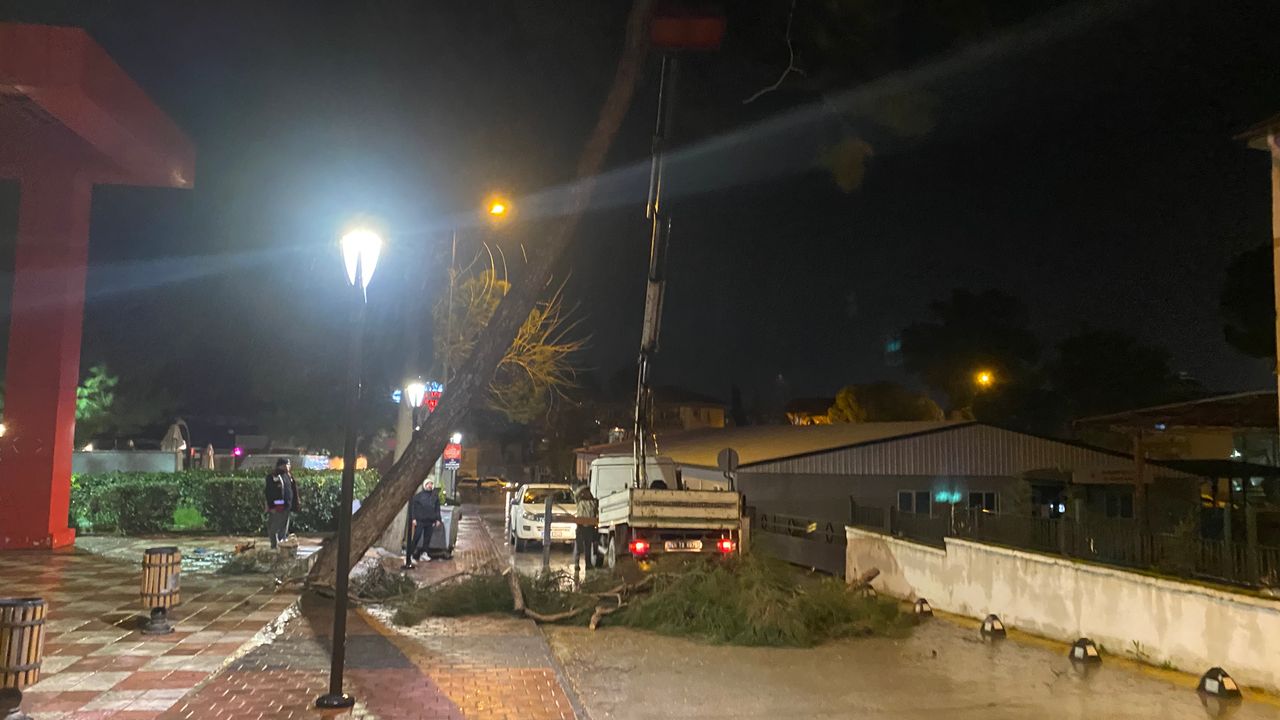 Manisa'nın Alaşehir ilçesinde etkili olan şiddetli yağmur ve rüzgar, yarım asırlık çam ağacını devirdi. Cadde üzerine yan yatan ağaç nedeniyle yol ulaşıma kapanırken, ekiplerin yaklaşık iki saat süren çalışmasının ardından cadde yeniden trafiğe açıldı.